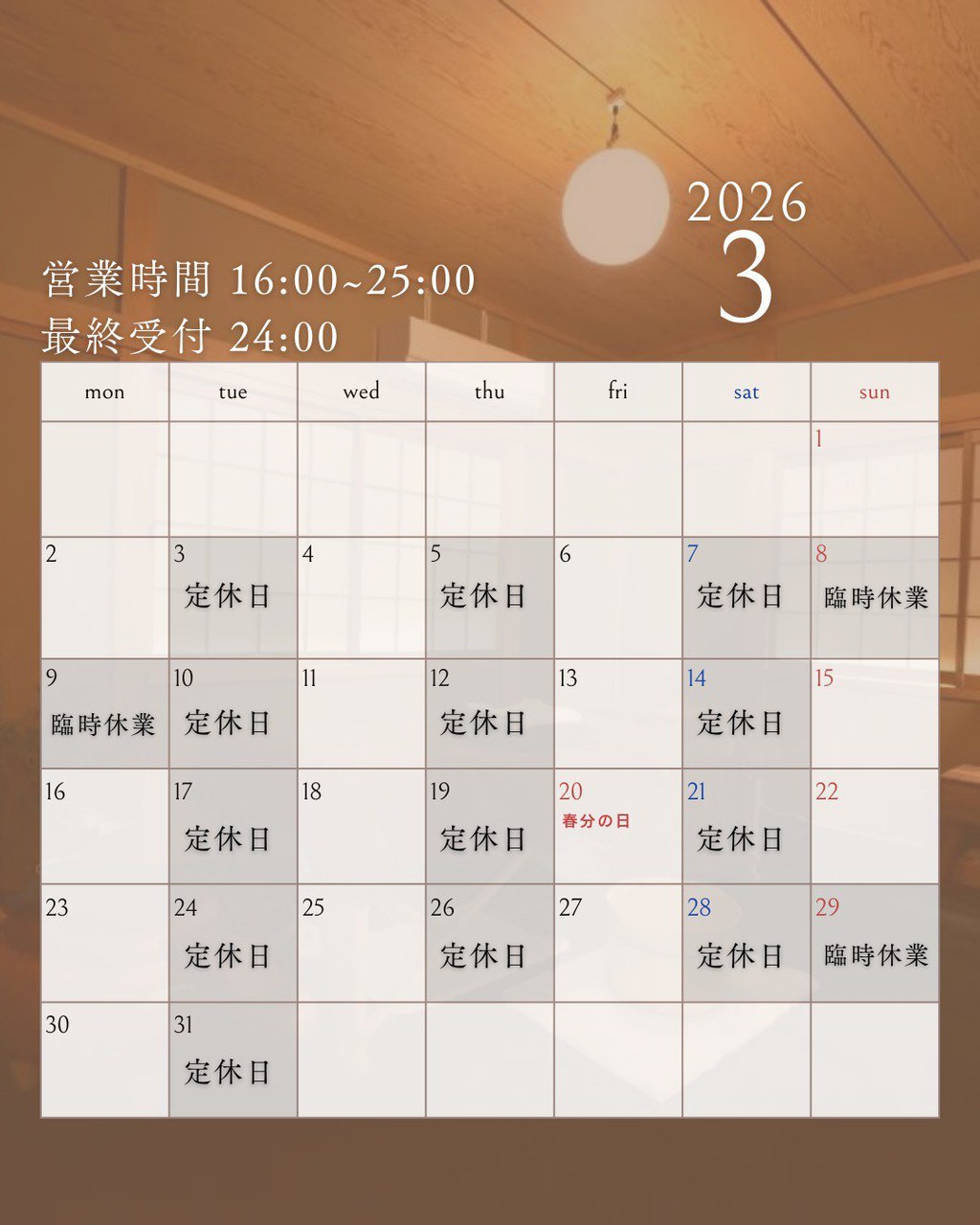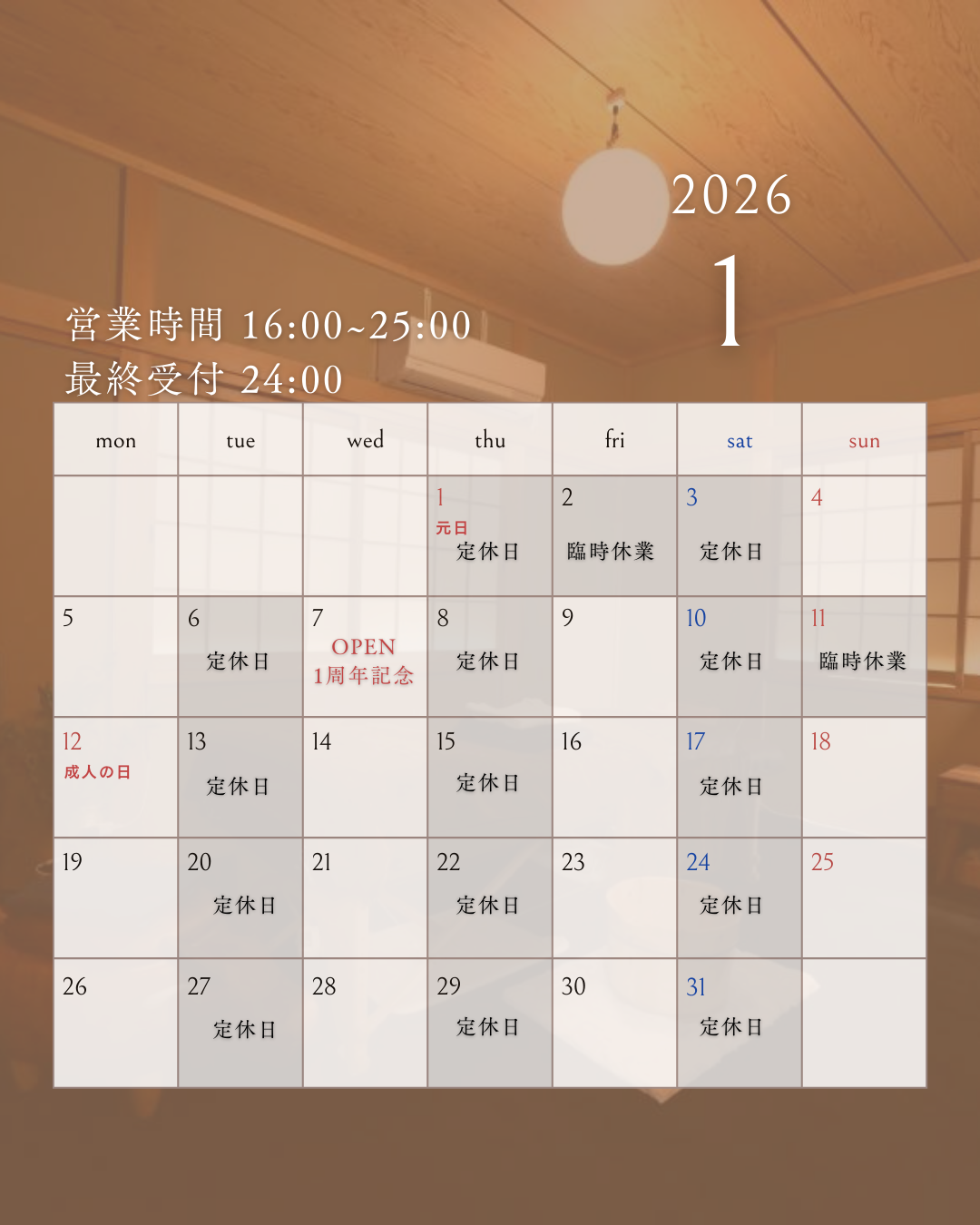 ご来店が24時を過ぎる場合はお電話にてご連絡ください。